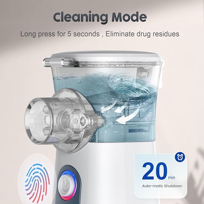 - ✅ Inhaler Machine for Adults and Kids - The mesh mist machine has Self-Cleaning Mode. Long press 5s to turn on the self-cleaning mode(all three lights are on), which can be used for daily cleaning to avoid clogging.